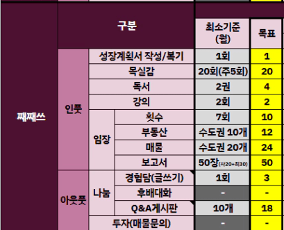 - 나눔: 주 1회 나눔글 작성+ 매일 Q&A 답변 1개 이상 작성