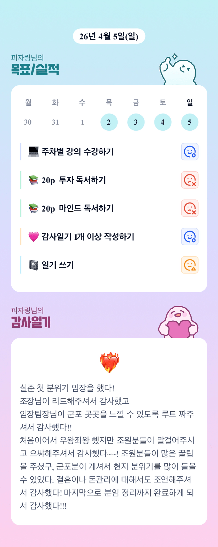 먼길에 첫 분임이라 쉽지않으셧을텐데 끝까지 잘 마무리 하셧어요 ㅎㅎ 2주차도 화이팅하시죠~