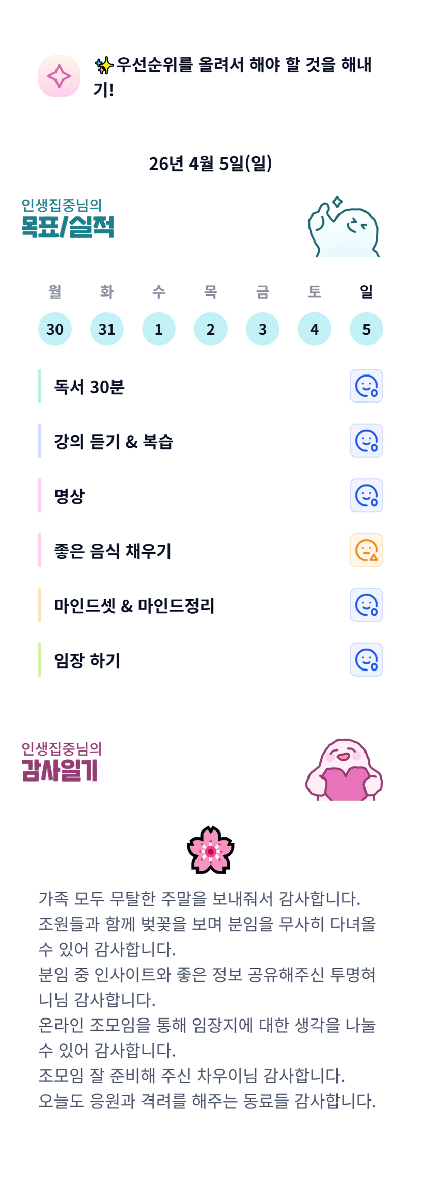 집중님 분임 다녀오셨군요. 오늘도 수고 많으셨어요. 꿀잠 주무세요~