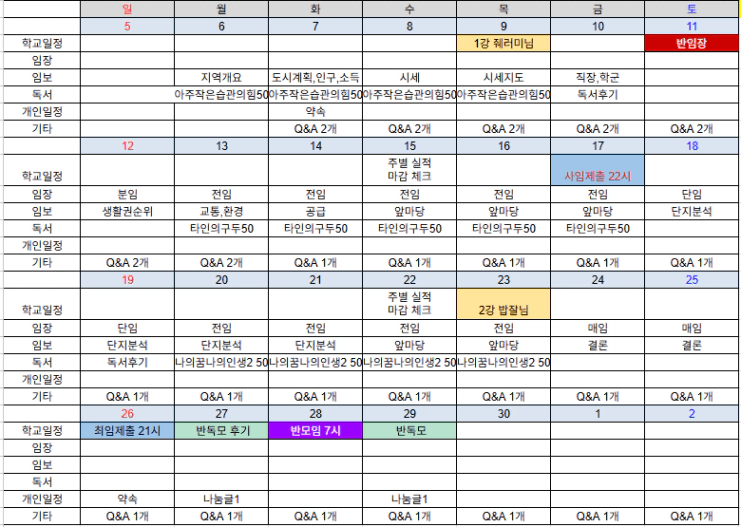 - Q&A는 지난 학기에서 했듯이 매일 이동시간과 틈시간을 이용해서 매일 1-2씩 하기
