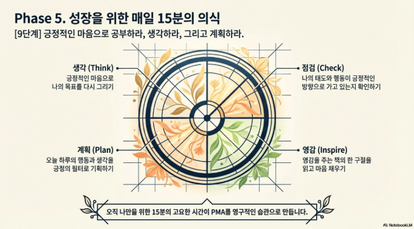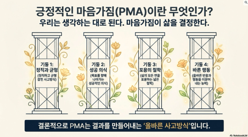 결론적으로 PMA는 모든 것을 이룰 수 있는 힘의 원천이고 올바른 행동으로 결과물을 만드는 올바른 사고방식이다.