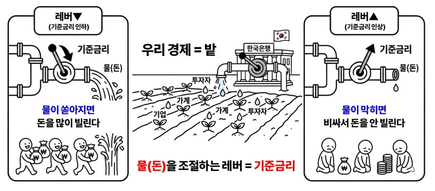 물의 양을 조절하는 레버(기준금리)를 조절하고 있어요.