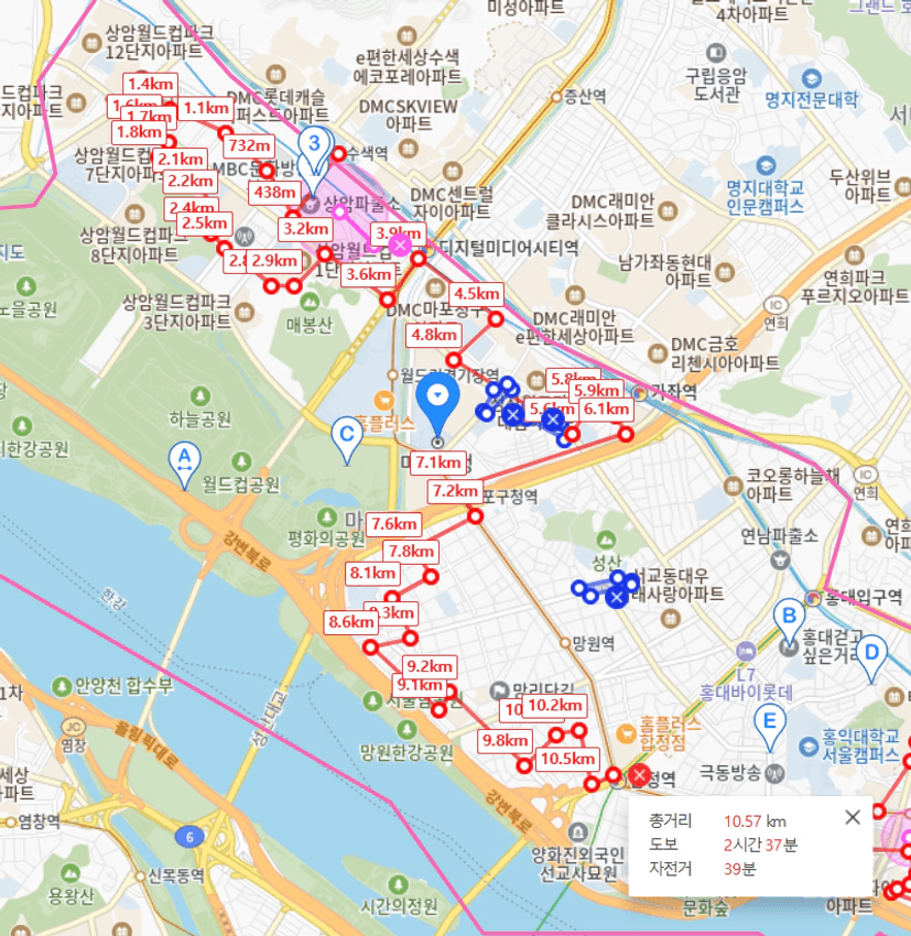 (공덕역 - 아현역 -마포역 - 대흥역 - 이대역 - 신촌역 - 서강대역 - 광흥창역 - 서강대역)
