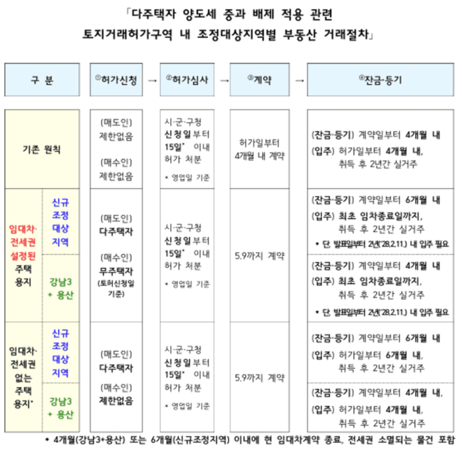 ' '25.10.16. 새로 지정된 조정대상지역(서울시 강남구 서초구 송파구 및 용산구 이외의 조정대상지역) 소재 주택의 경우 '26.5.9.까지 매매계약을 체결하고 계약일 로부터 6개월 내에 양도하면 양도소득세가 중과되지 않는다. 지난해 조정대상지 역으로 신규 지정되어 중과대상이 된 점을 감안하여 기존 조정대상지역에 비 해 2개월의 추가 여유기간을 부여하는 것이다. 이 경우 매수자는 2개월의 추가 여유기간이 부여되었으므로 토지거래허가일로부터 6개월 내 해당 주택에 입주하면 된다.'