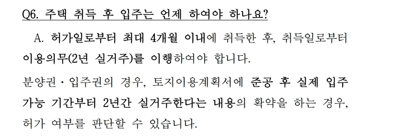 나부자님 안녕하세요? 저도 궁금했던 내용인에 이렇게 질문을 남겨주셔서 한 번 더 생각해볼 수 있는 시간이 되었던 것 같아 먼저 감사드립니다. 저 역시 광명시청에서 답변해주신 시점과 새로나온 규정의 발표 시점이 달라서 생긴 문제라고 생각됩니다. 최신 규정을 반영하여 허가 이후 6개월 이내 잔금 및 입주로 생각하시면 될 같지만, 저라면 그렇더라도 해당 지자체에 문의를 직접하고 확인을 받아볼 것 같습니다. 혹시 모르니 해당 통화내용이나 답변은 꼭 녹음이나 캡쳐를 해둘 것 같아요 ^^ㅎ 아무쪼록 원활한 입주를 기원하겠습니다.