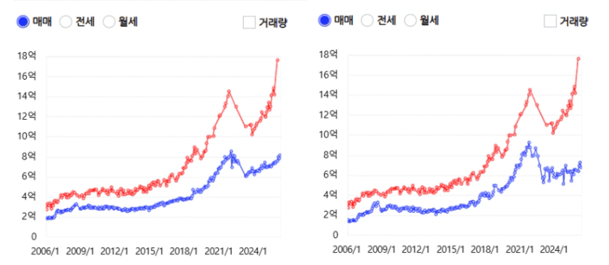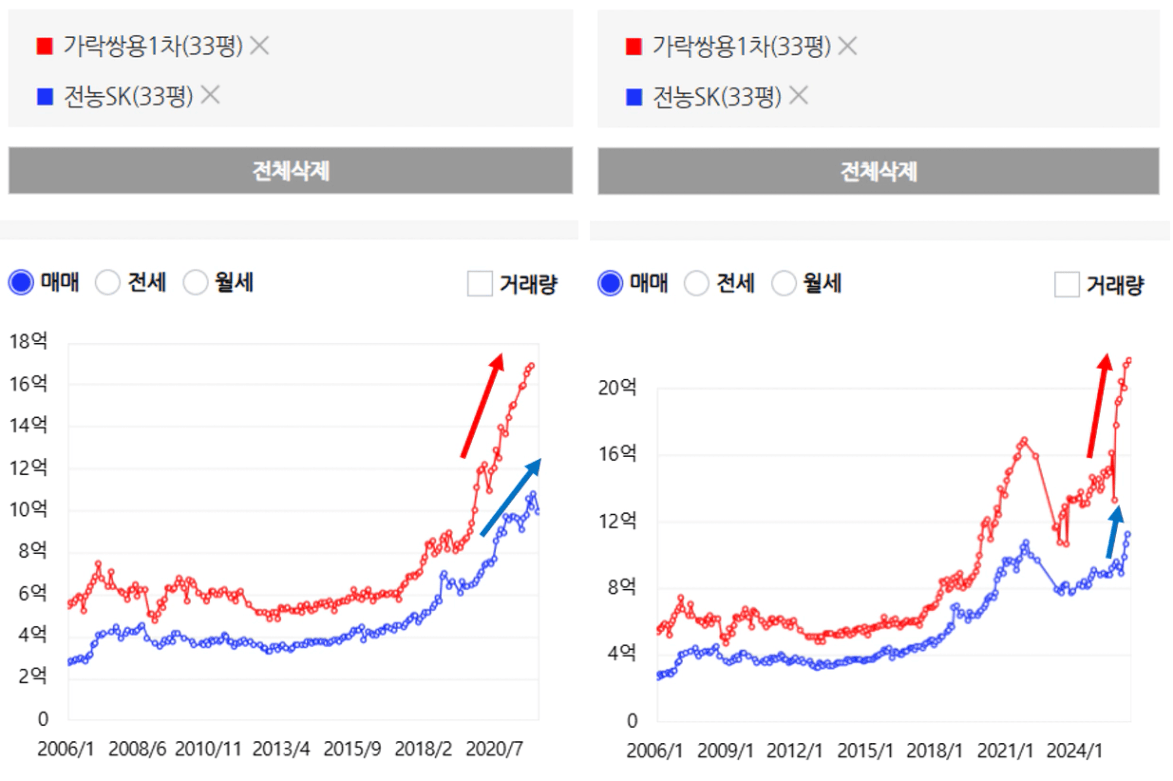 이 두 단지의 매매가 추이를 보면,