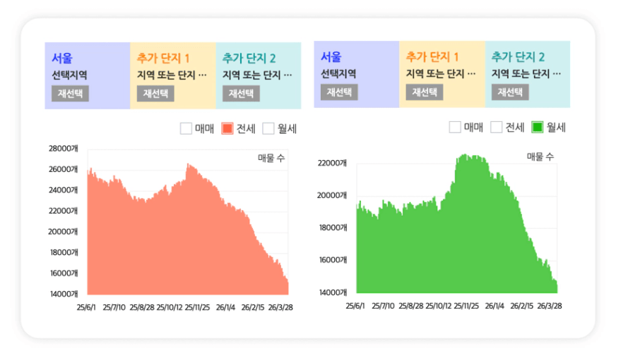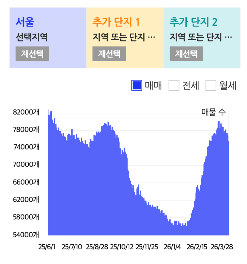 3월 21일에는 서울 매물이 약 8만 건까지 늘어났죠. 그런데 현재는 7.5만 건으로 다시 줄어든 상황입니다.