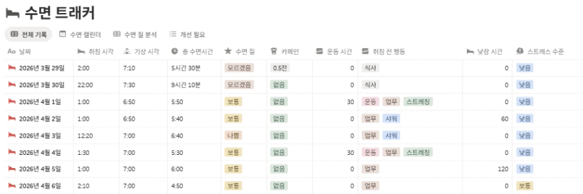 수면 시간, 컨디션을 계속 기록하고 있습니다.