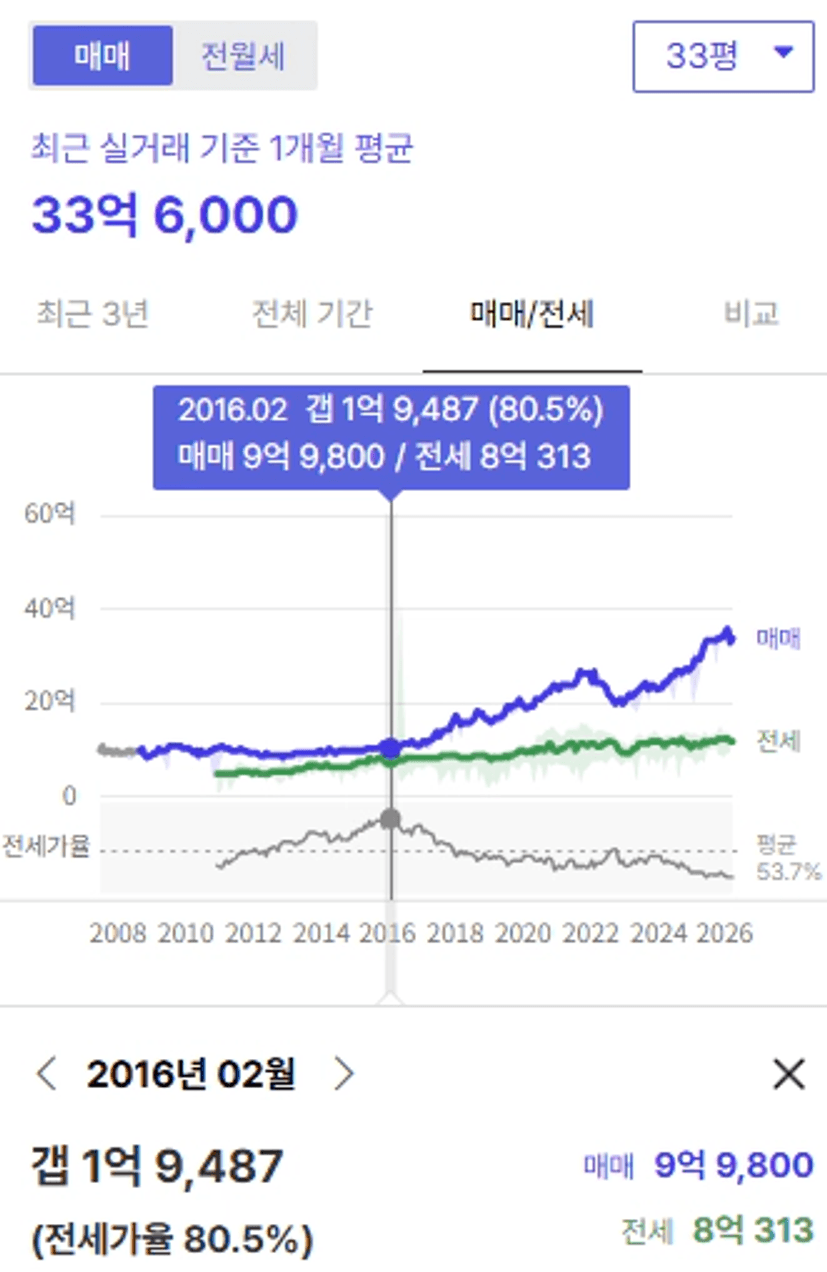 하지만 과거 2016년 전세가율은 무려 80%에 육박했습니다.