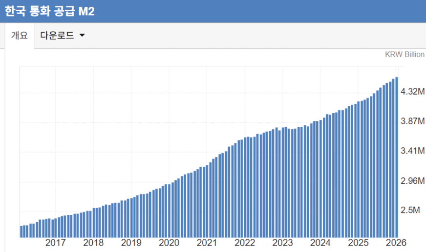 2016년과 2026년에 풀린 통화량의 차이는 거의 2배입니다.