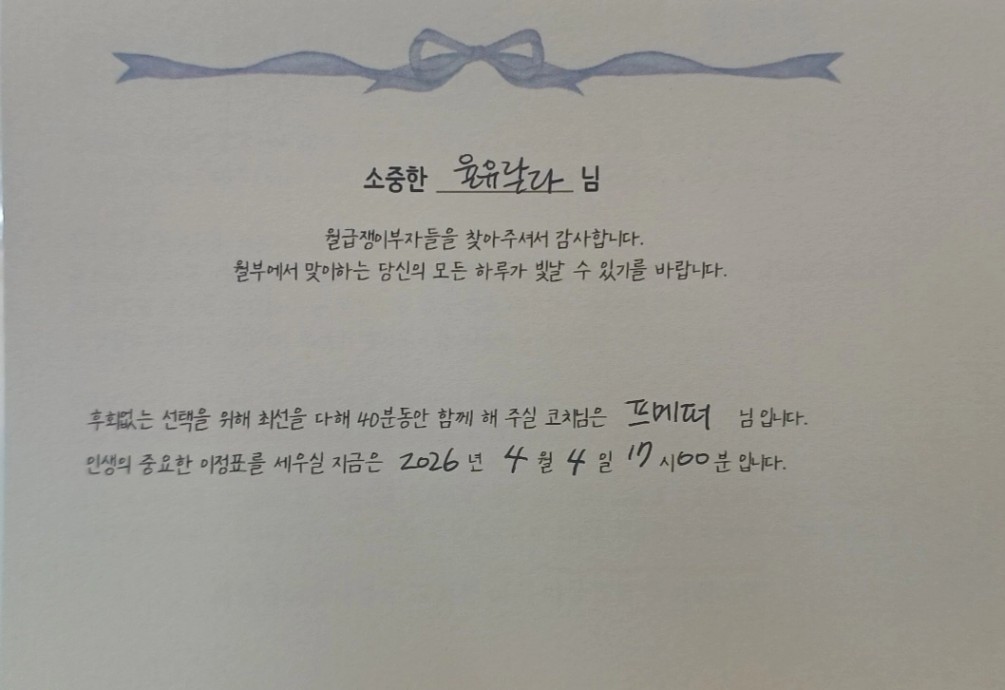 랄라님 후기글만 봐도 얼마나 뜻깊은 시간이셨을지 느껴지는 것 같아요!! 투코 준비 팁을 10000% 활용하시고 가신 것 같아 존경스럽습니다ㅠㅠ 이제 뚜렷한 방향성으로 나아가실 일만 남으셨네요ㅎㅎ 늘 응원하고 있겠습니다! 언젠가 또 투코를 받으러 간다면 랄라님 후기 한번 더 읽고 준비해야겠어요 따끈따끈한 후기 남겨주셔서 감사합니다!