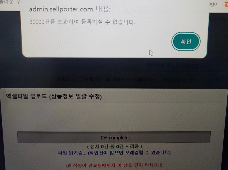엑셀 내용을 나눠서 업로드하시면 해결되세요ㅎㅎ 3만건까지가 한계이여서요ㅎ