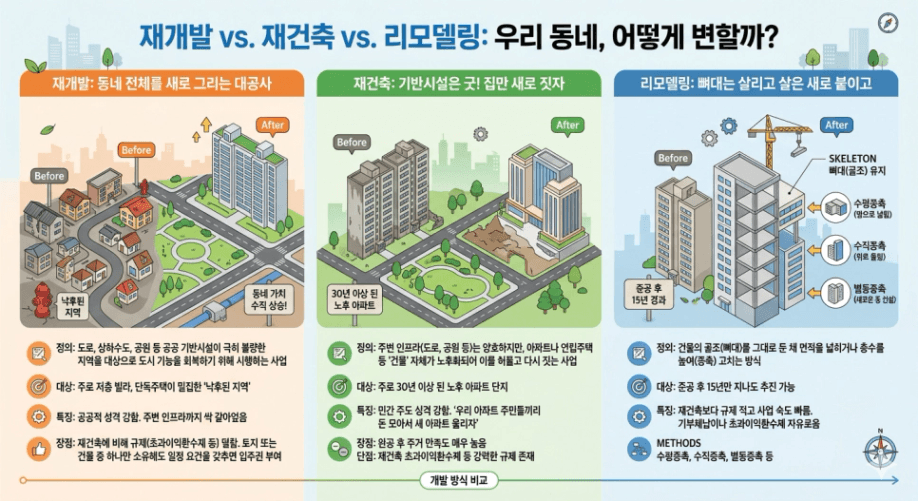 그럼 지금부터 재개발, 재건축, 그리고 리모델링