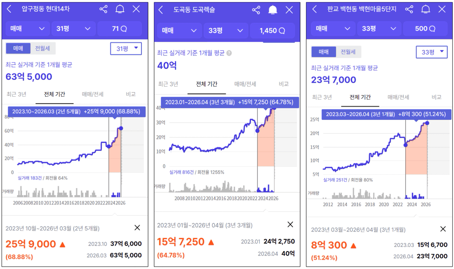 강남구는 약 170% 상승, 판교는 약 150% 상승했어요.