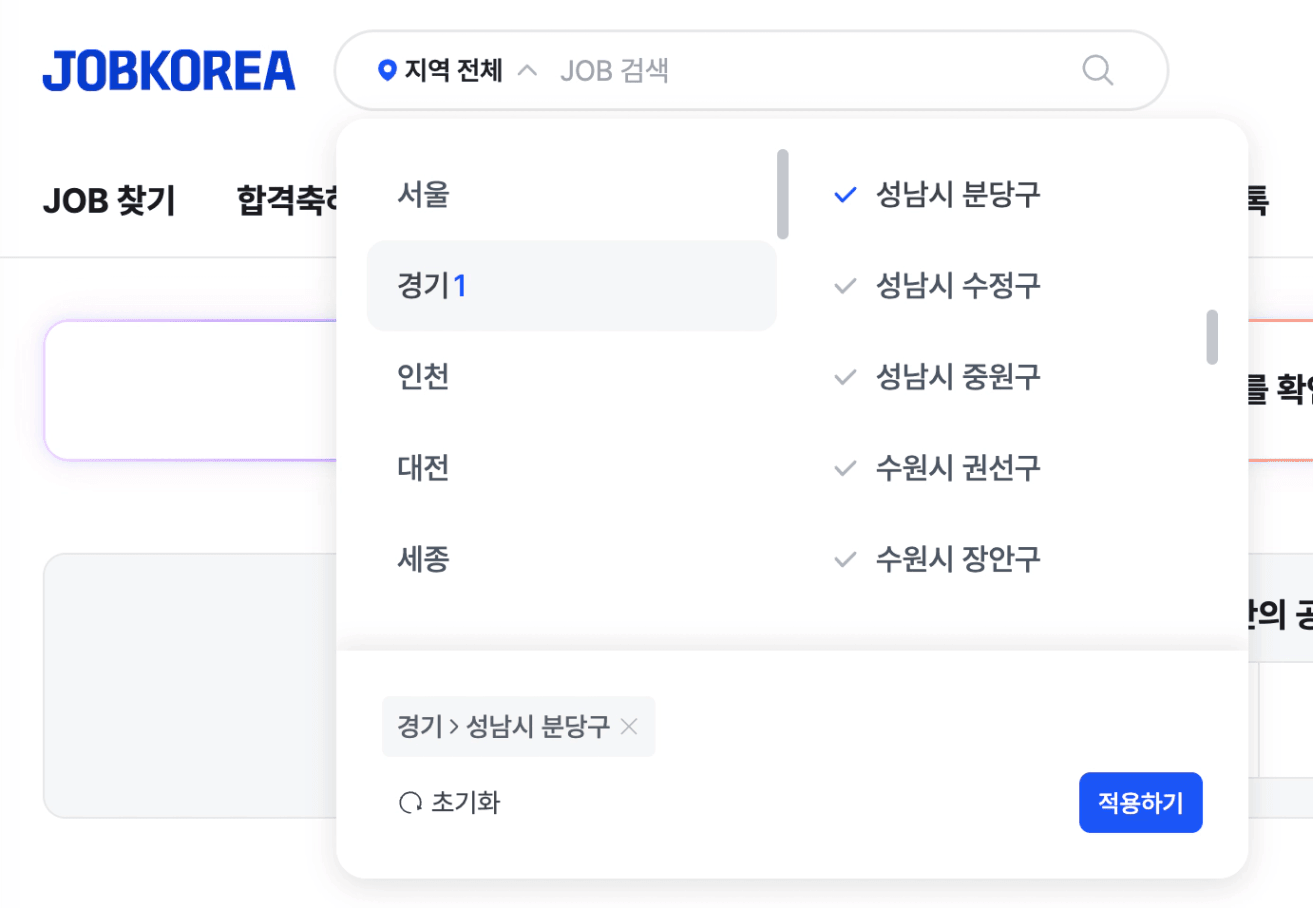 ② 잡코리아 / 원티드 지역 필터