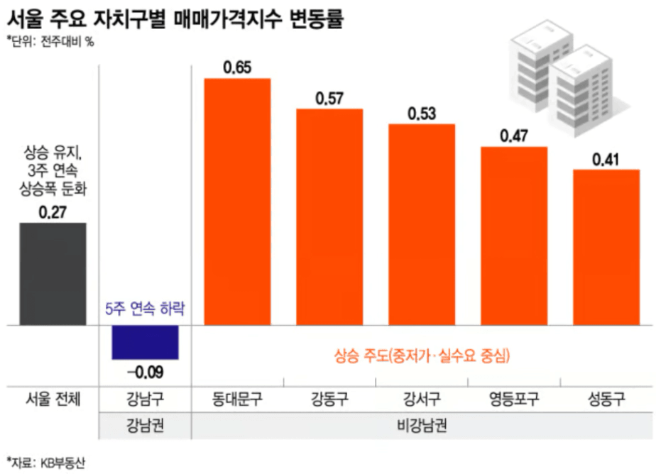 강남구는 -0.09%로 기록하며 5주 연속 하락세를 보이고 있습니다.
