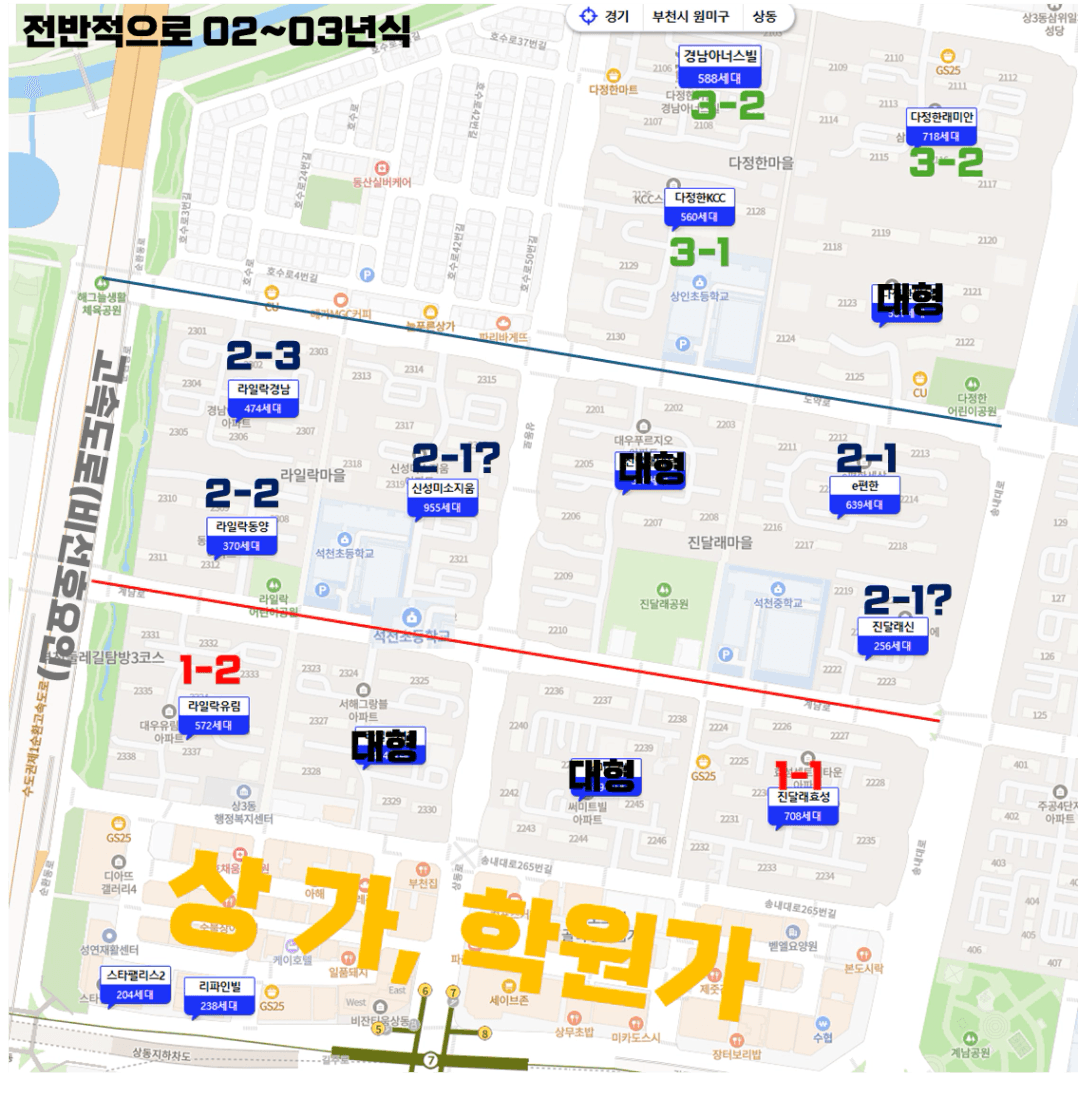이렇게만 나눠도 단지들이 한 덩어리로 보이기 시작한다는 점입니다.