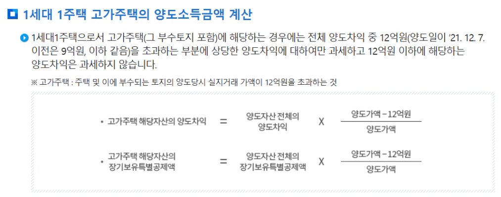 고가주택인 경우 양도차익 12억을 초과하는 초과분에 대해서는 세금이 부여된다는 것입니다.