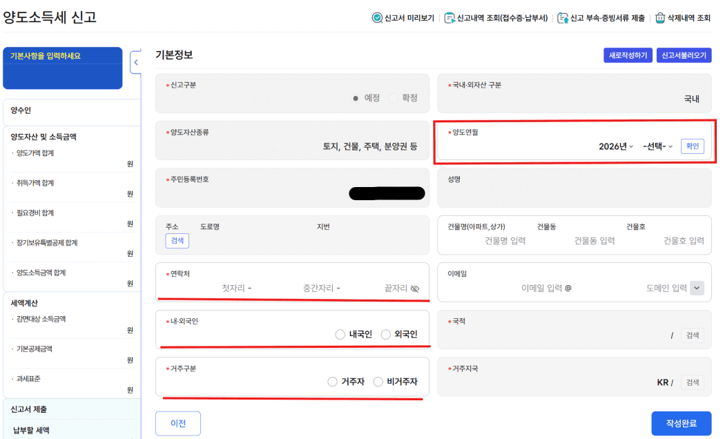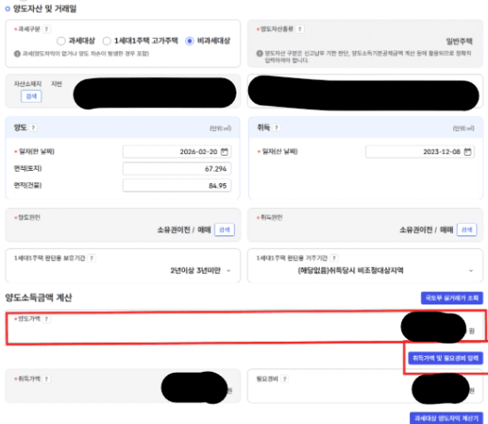 양도 물건 종류, 양도 연월 선택 후 [조회] 클릭하여 내용 확인 및 입력합니다.