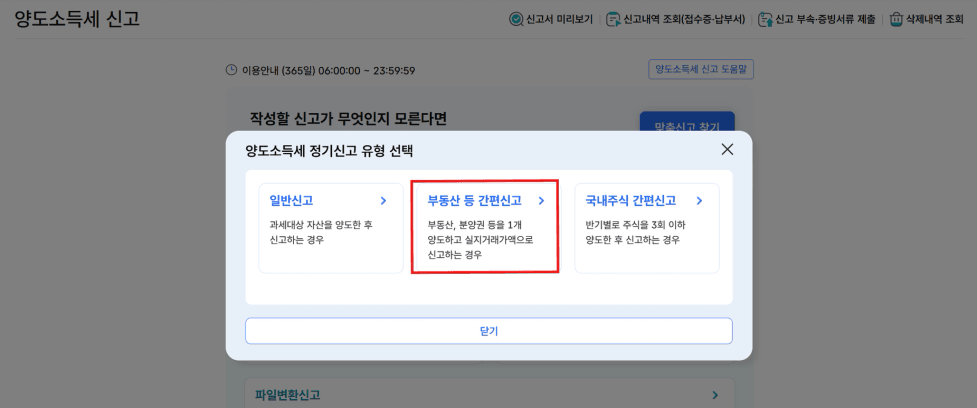 그럼 정기신고유형이 뜨는데, 보통은 [부동산 등 간편신고]에 해당되니 간편신고를 선택합니다.