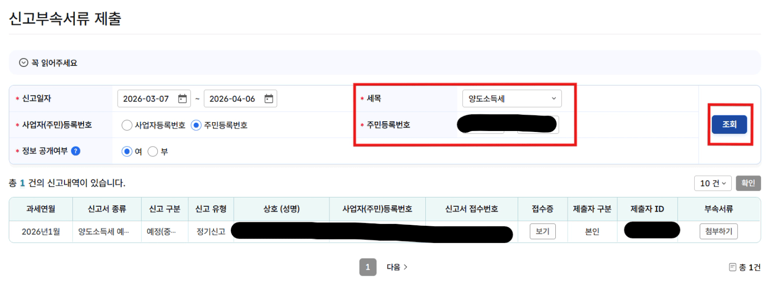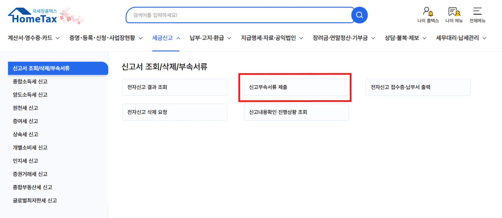 [세금신고] > [신고서 조회/부속서류] > [신고부속서류 제출]에 들어가서 세목과 주민등록번호를 조회하면