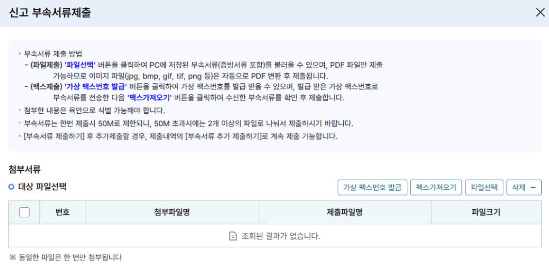 신고내역이 뜹니다. 관련된 부속서류 첨부하기를 클릭하면 첨부문서를 PDF로 업로드할 수 있습니다.