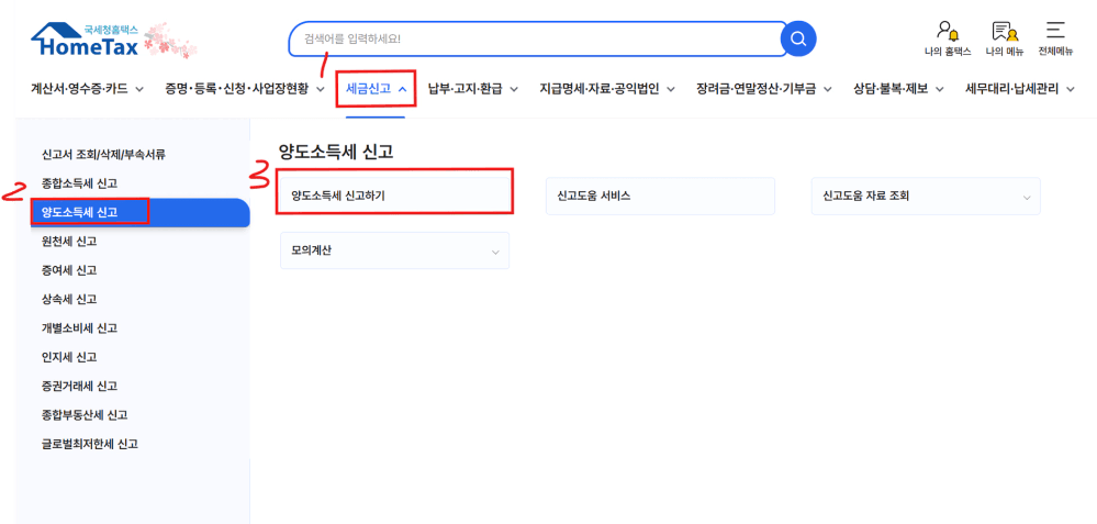 [세금신고] -> [양도소득세] -> [양도소득세 신고하기] 클릭합니다.
