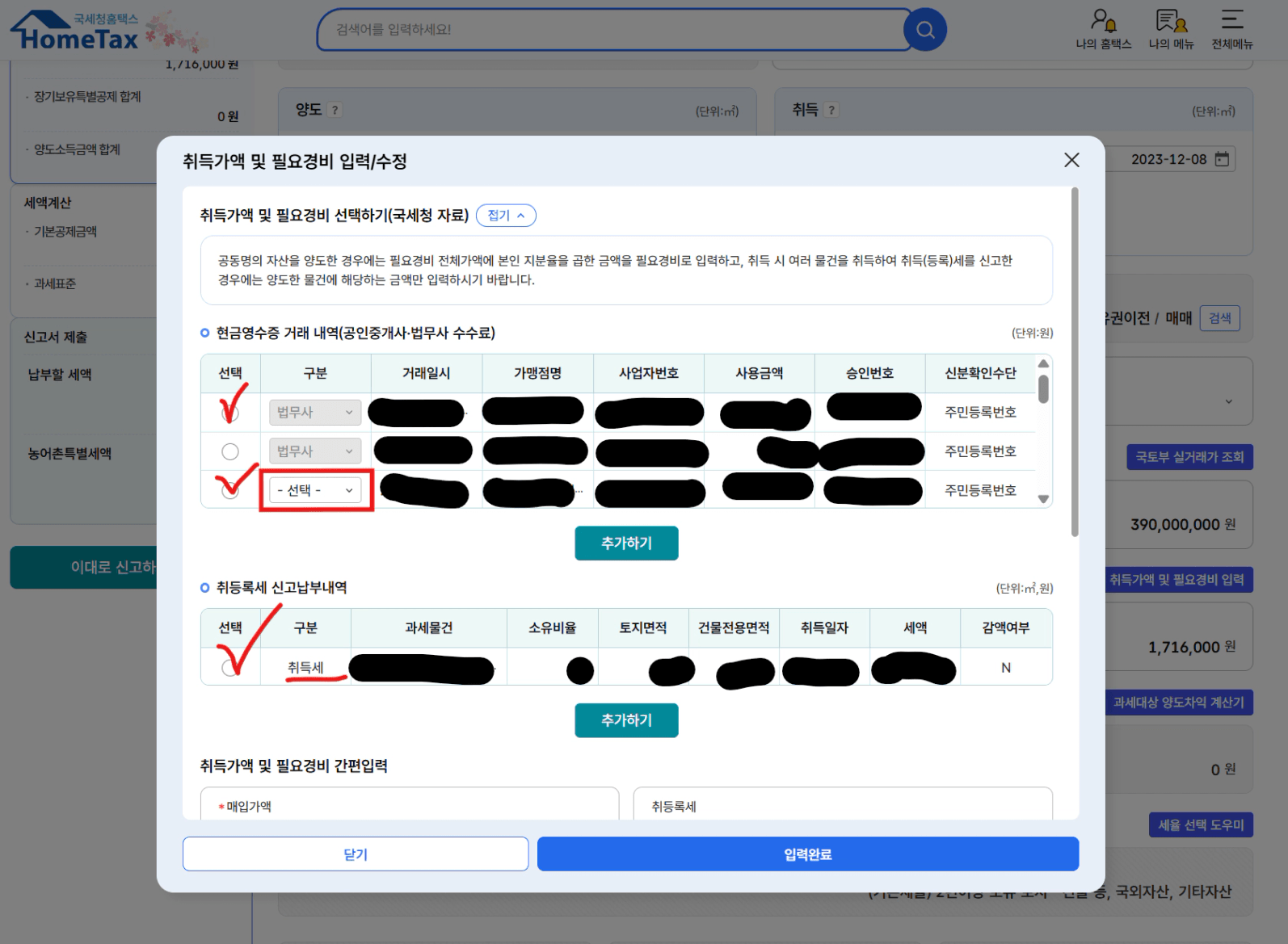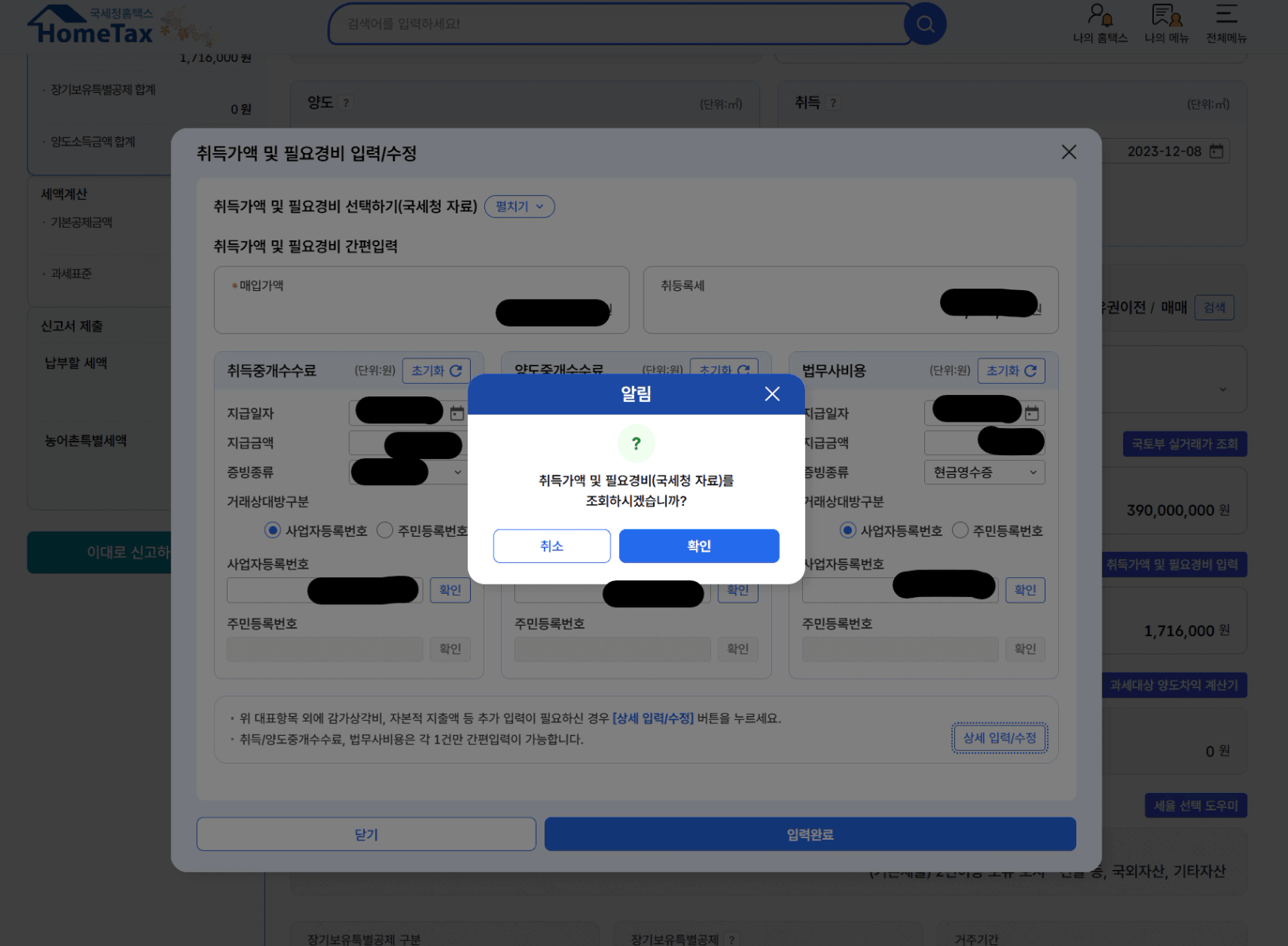 양도가액 (매매한 금액)을 입력하고, [취득가액 및 필요경비] 버튼을 눌러 취득세, 중개 수수료, 법무사 비용 등 증빙 서류 내역 입력합니다. 이것도 [국세청자료를 조회]하면 모두 자동으로 불러와집니다.