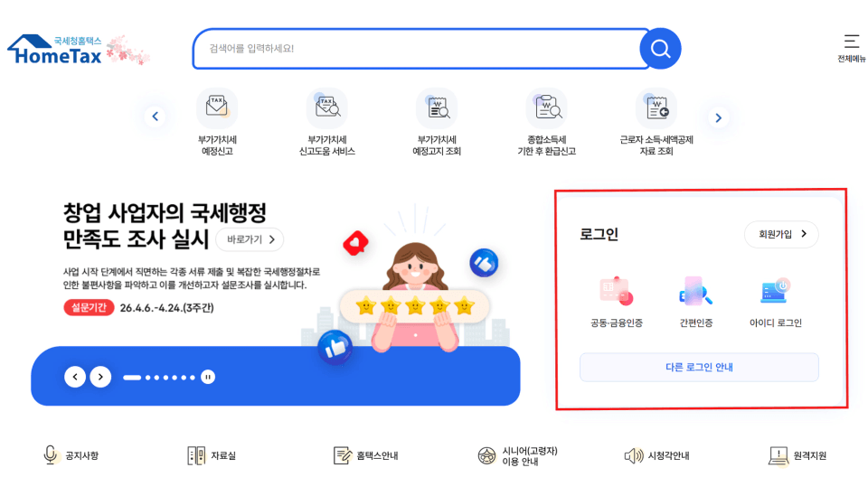 1. 홈택스 접속 후 공동/금융인증서 로그인을 진행합니다.