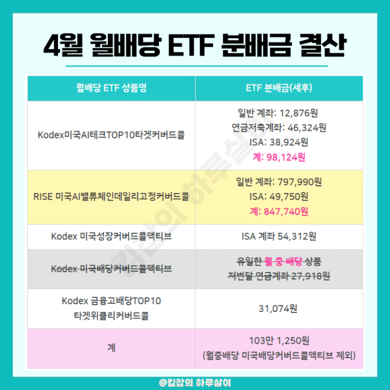 | 계 | 103만 1,250원 (월중배당 미국배당커버드콜액티브 제외) |
