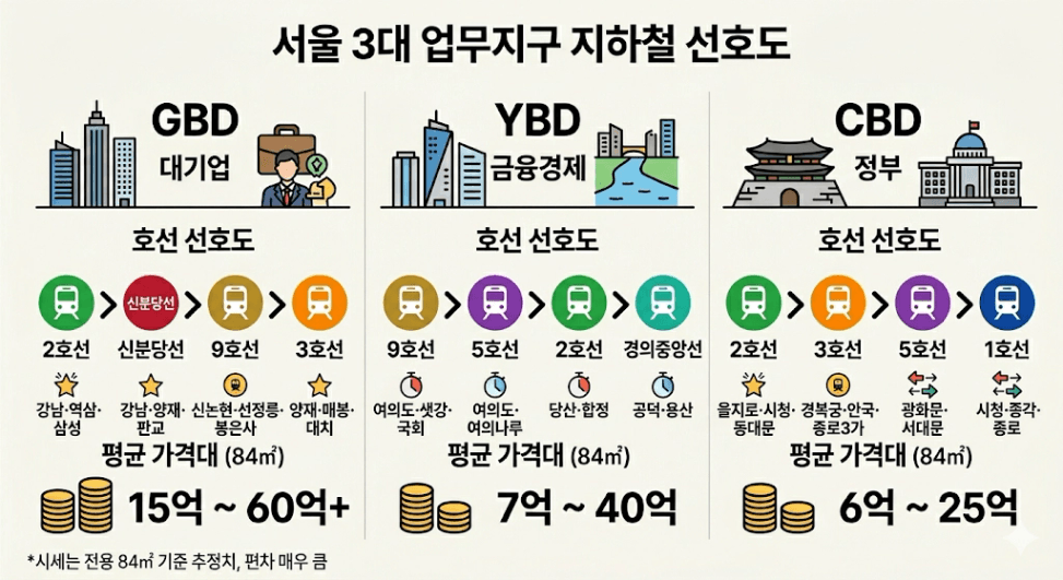 서울의 3대 핵심 업무지구(GBD, YBD, CBD)와