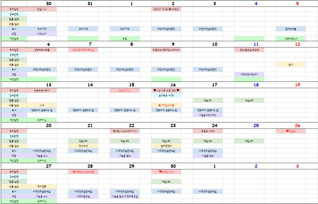 투자 준비로 임장 횟수가 높았습니다. 2매도 후 갈아타기 까지 완료했으나 분명한 아웃풋 하나가 있었지만 나머지 것들이 아쉬운 달이었습니다. 분명한 아웃풋 하나에 다른 것들 놓치지 않고 기본으로 해내겠습니다.
