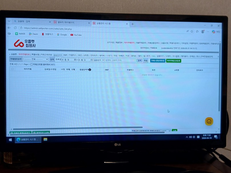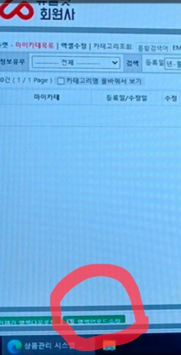 마이카테업로드시 유플렛 마이카테관리 로 들어갔는데 액셀관리가 없어요
