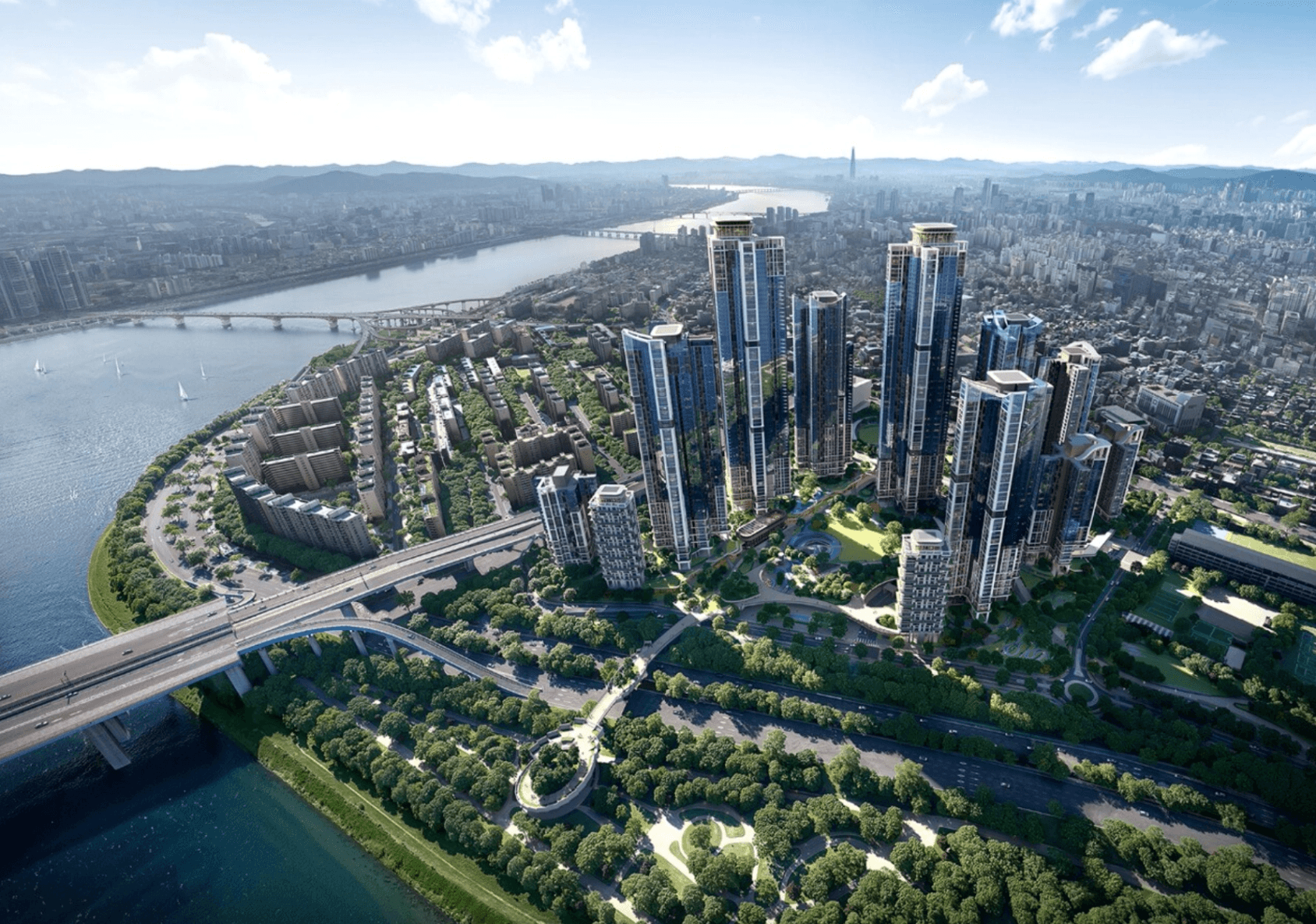 한강을 끼고, 강남 핵심 생활권에, 초고층 신축 단지들이 일렬로 세워지는 장면.