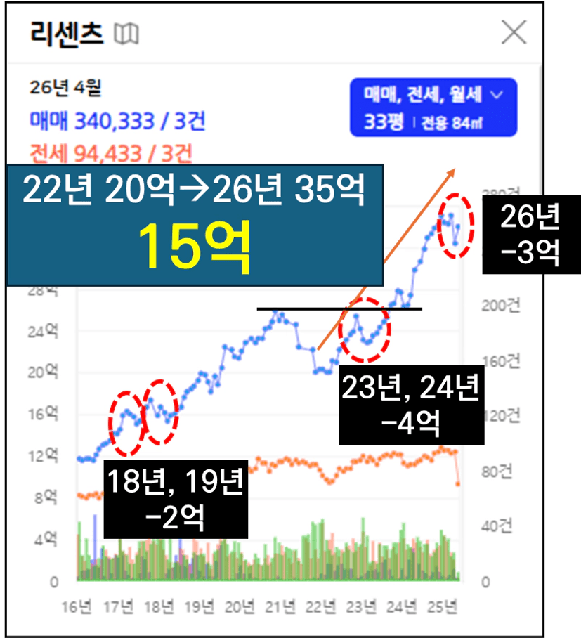 22년 바닥에서부터 26년 초까지 대략 15억이 상승했습니다.