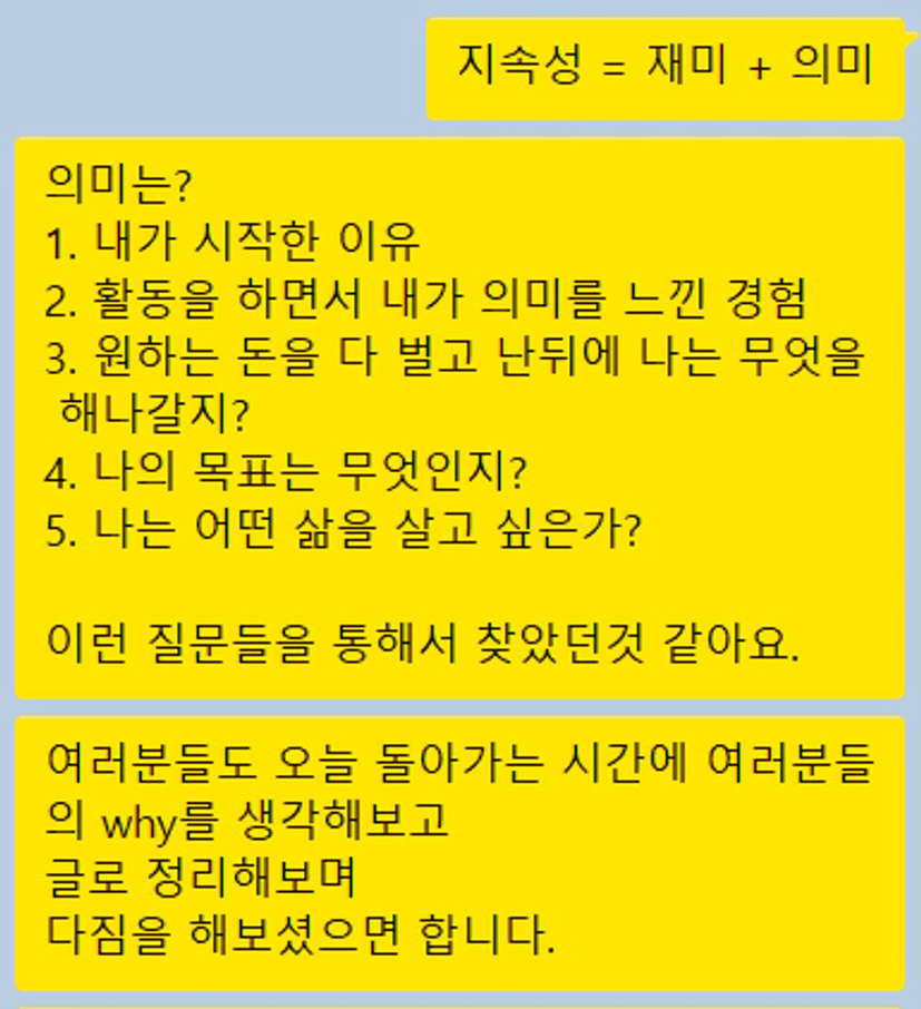 >> 지속성은 자전거와 같아서 두개의 페달이 있는데, 하나는 재미 하나는 의미라고 합니다. 재미는 사일클이 짧아서 재미로 몇번 밟아서 나아갈 순 있지만 재미로만은 오래, 멀리 갈 순 없는거죠. 그래서 우리에겐 의미가 필요하다고 합니다. 의미는 우리를 더 멀리 더 오래 나아갈 수 있게 해줍니다.
