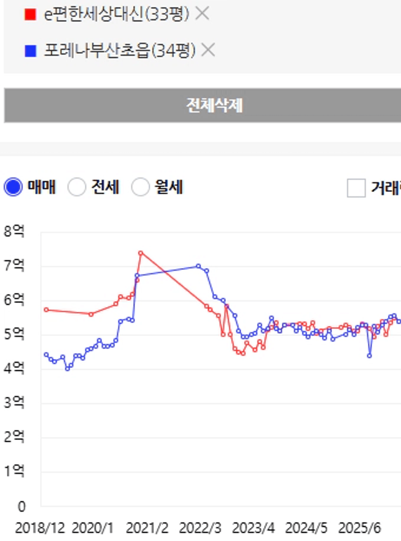 포레나초읍과 e편한대신은 비슷한 전세가였지만