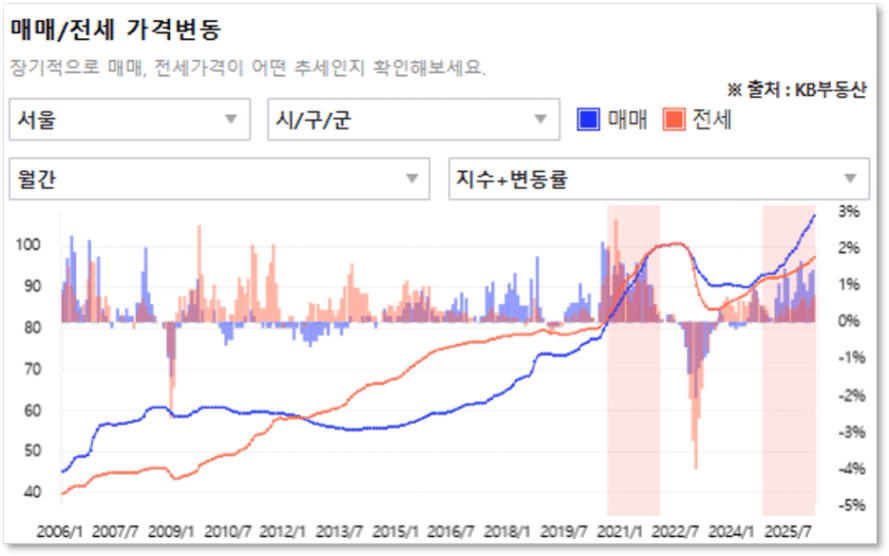 서울의 매매, 전세 지수를 보면