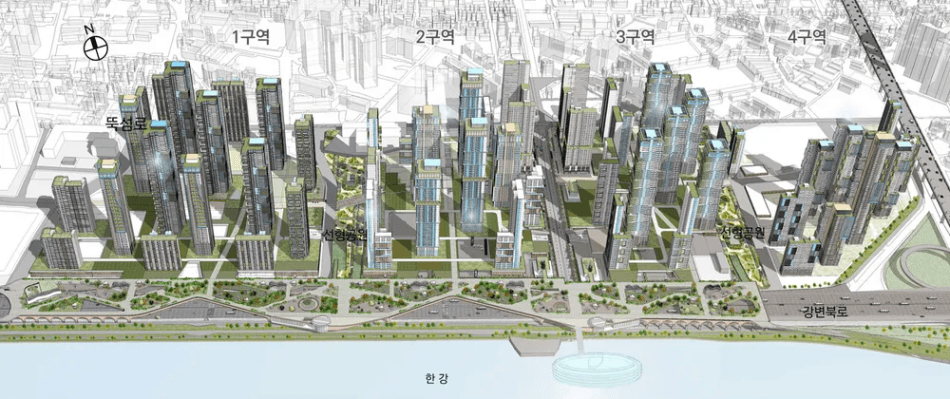 1지구 | 약 3,000세대 | 서울숲과 가장 인접해 있으며 입지가 가장 좋다고 평가받는 대장주로, 65층 이상 설계를 추진 중이며 시공사 선정을 앞두고 있습니다. |