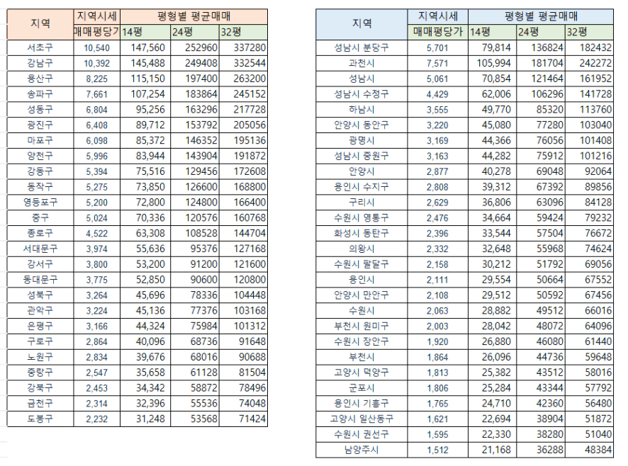 아래 지역별 평균 평형별 매매가를 첨부했어요