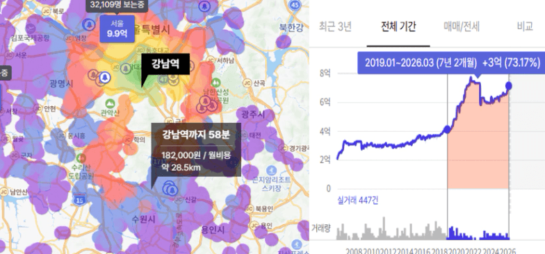 첫째, 강남을 대중교통으로 1시간 이내로 갈 수 있는 곳