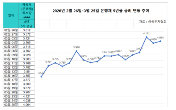 - 중동 전쟁 리스크 : 유가 상승으로 인한 인플레이션 우려가 시장 금리(은행채 금리)에 선반영됨