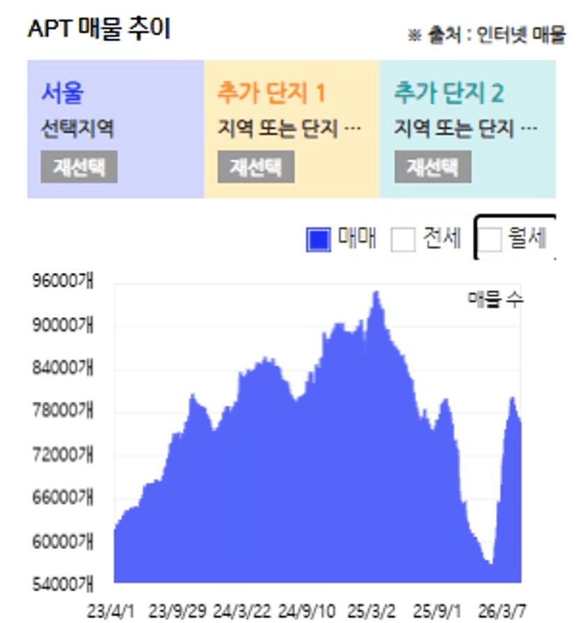 - 매매 매물은 다주택자 양도세 중과 이슈로 늘어나는 듯했으나, 전세와 월세 매물은 3년 전의 1/3 수준 급감