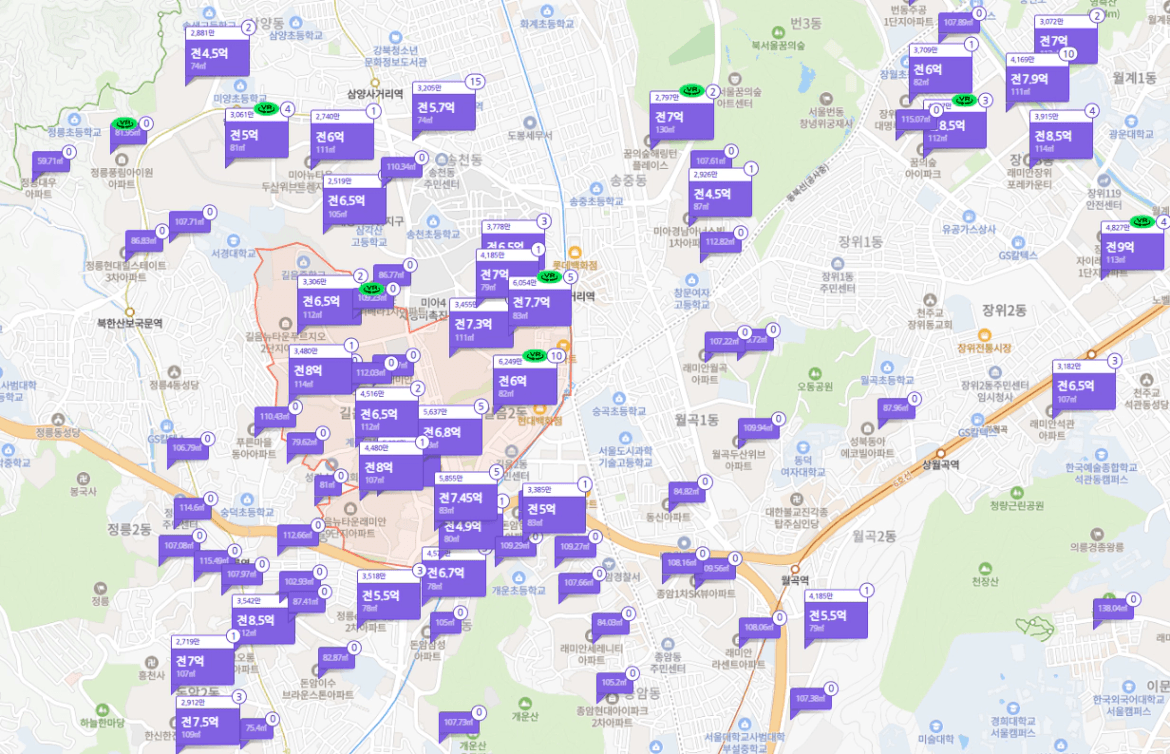 대부분 단지들의 전세가 0개이고, 전체 성북구로 넓혀도 50개 내외 수준이다… 말도 안되는 수준이다 정말.