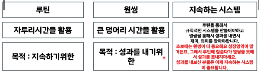 루틴을 하다가 원씽을 못하면 안된다. 퇴근하고 2-3시간 있는데 루틴 강박때문에 통시간을 버리면 안된다.