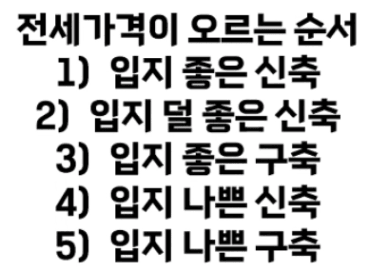 전세가격 : 입지 좋은 신축 > 입지 덜 좋은 신축 > 입지 좋은 구축 > 입지 나쁜 신축 > 입지 나쁜 구축