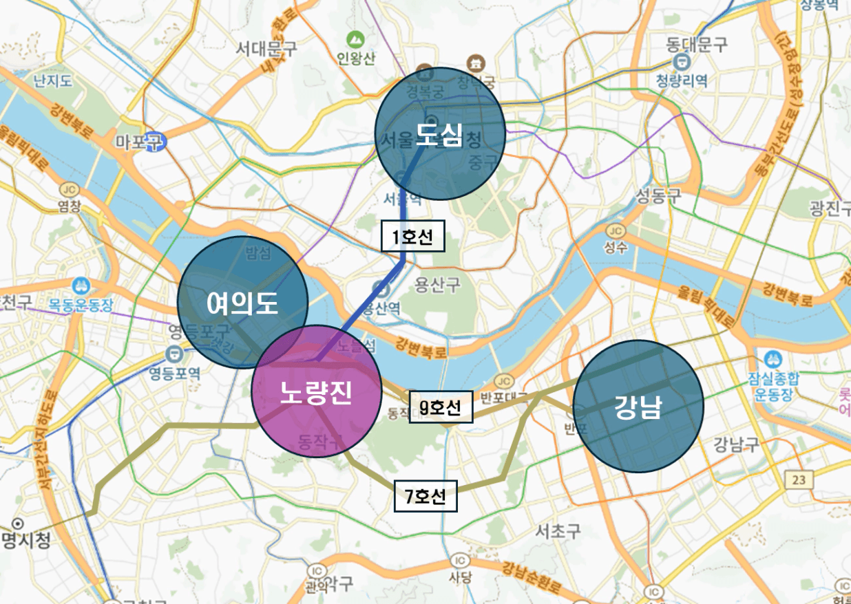 노량진은 3대 업무지구를 30분이내 갈 수 있는 서울의 진짜 “노른자 땅”에 위치하고 있습니다.