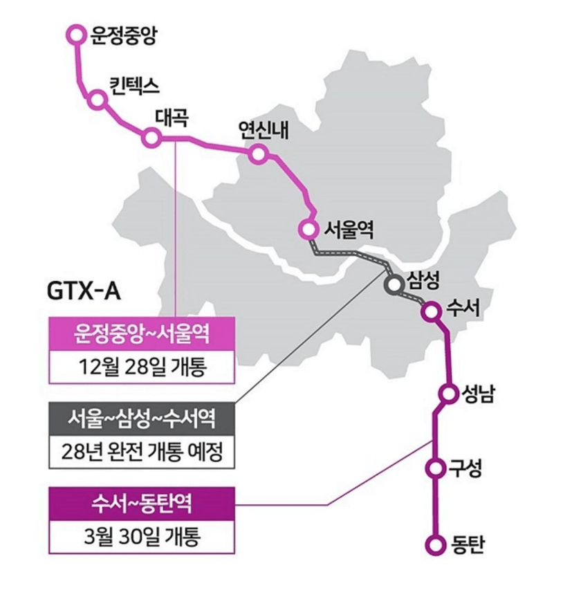 현재 일부 구간이 개통되었고, 핵심 정거장인 삼성역은 2028년에 완전 개통을 목표로 하고 있습니다. 현재 삼성역은 대규모 공사가 진행 중인데요. ‘영동대로 지하공간 복합개발’과 함께 GTX-A가 연결된다는 것이 의미가 있습니다.