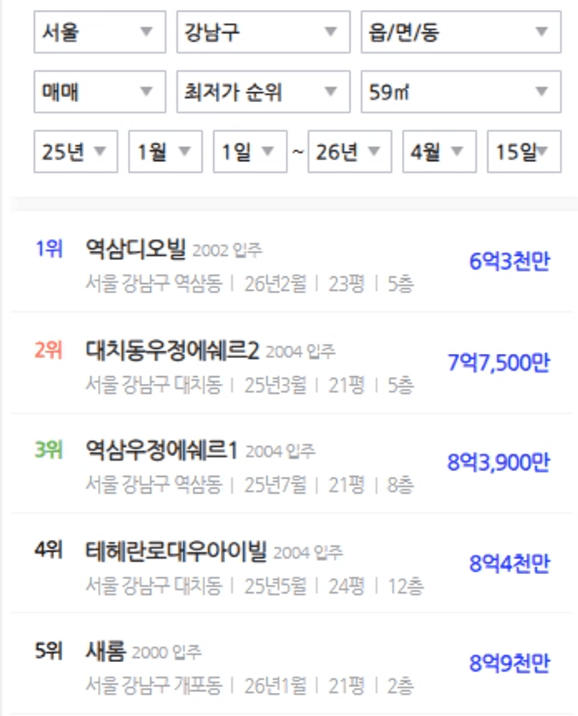 2025년 1월부터 현재까지 기준으로 강남에서 20평대 최저가 순위를 보니까 최대 6억까지 대출이 가능한 보금자리론으로 살 수 있는 집이 없더라고요. 현실이 이렇다 보니 사람들은 강남과 가깝게 갈 수 있는 지역을 거주지로 선택하게 됩니다.