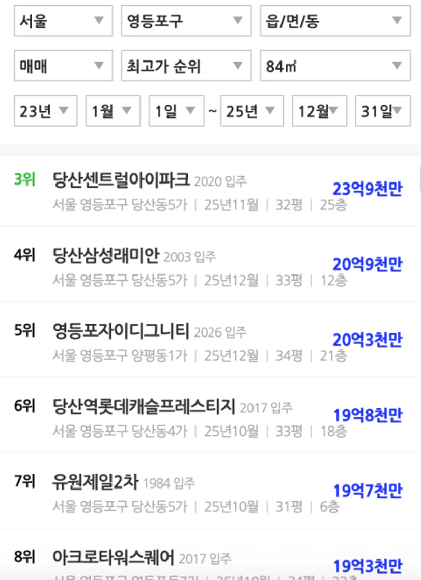 영등포구는 여의도를 제외해야 한다. 여의도는 동쪽으로는 잠실과 쌍둥이 입지며, 동북권에서는 성수전략구역 뒷단지들, 서북권에서는 서부이촌과 동급지로 본다. 아마 재건축되면 이들 지역의 가격은 비슷할 것이다. 그래서 여의도를 제외했다. 그러면 영등포구는 당산동이 나온다. 당산동은 2,9호선 역세권이고, 한강변이다. 또 아파트 밀집 지역에, 평지다. 아쉬운 점은 이제 평균 연식이 점점 높아지고 있으며 재건축 확률이 떨어지는 용적률 높은 단지들이 많다는 점이다. 당산동은 마포구 아현,공덕과 비견 할 만 하지만 시세를 리딩할 초대단지 신축이 없다는 점은 뼈아프다. 그럼에도 영등포 개발이 본격화 될 것이기 때문에 미래에도 졸는 입지로 남을 것이다.